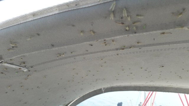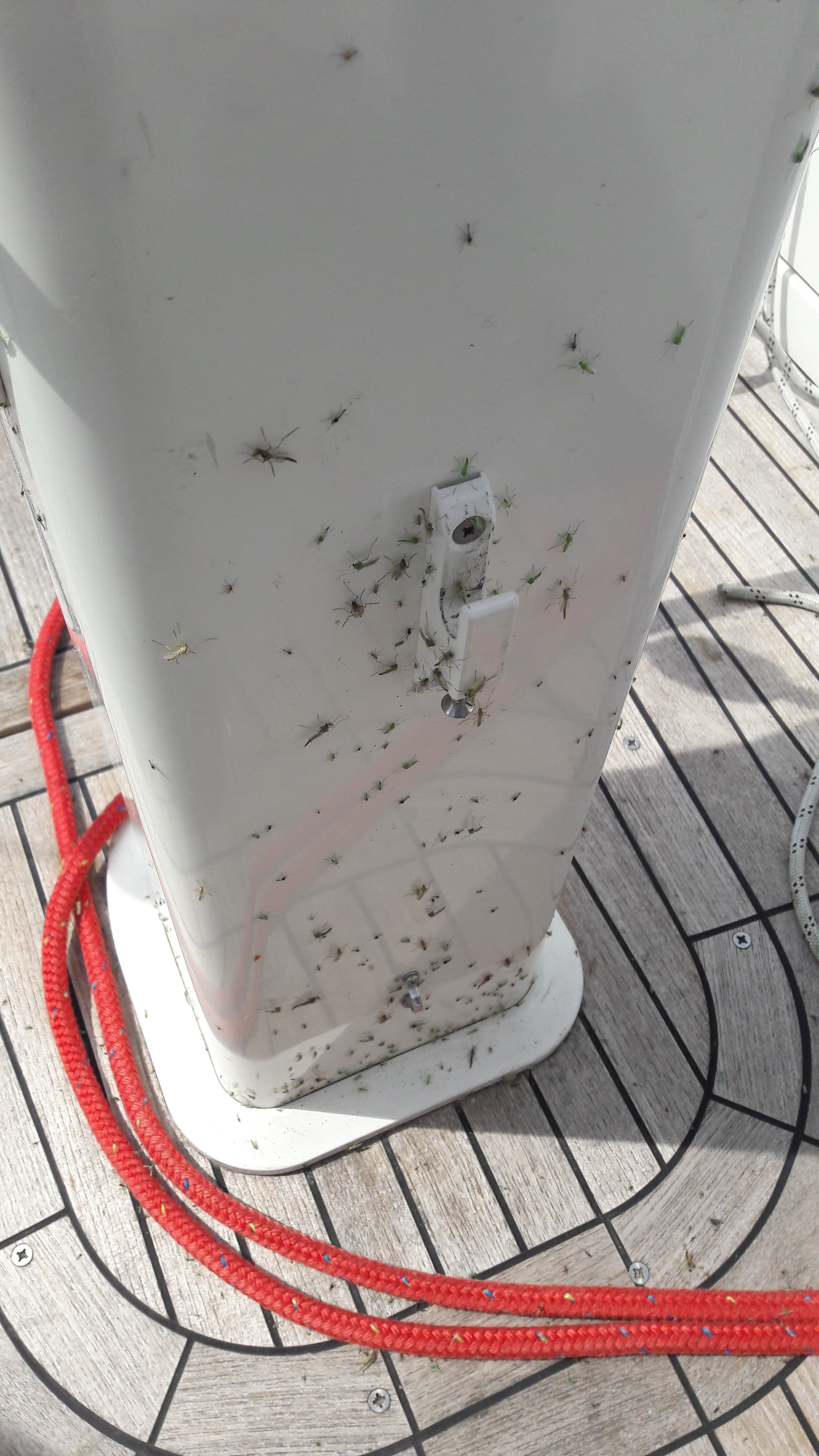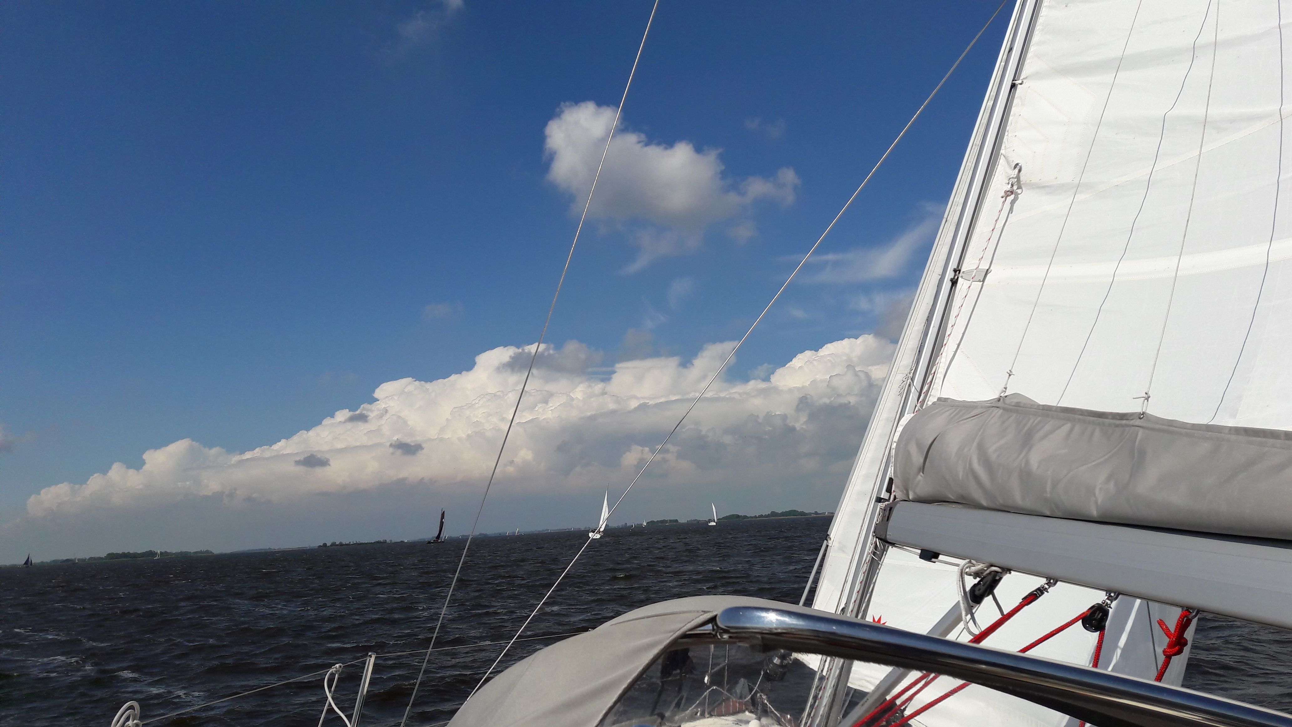 Kurz nach der Abfahrt die Ernüchterung: der Wind wird weniger. Egal, ich habe ja Zeit und will mal wieder nach Makkum. Der wenige Wind in Verbindung mit einem heftigen Schwell direkt von der Seite macht es auf dem Boot eher unangenehm. Als der Wind weiter nachlässt entscheide ich in der Mitte eines Dreiecks Enkhuizen – Stavoren – Lemmer den Kurs doch nach Medemblik zu ändern. Blöde Idee ! 5 Knoten Wind von achtern bei 5 Knoten Fahrt machen Windstille. Sofort nutzen massenweise fliegende Lebewesen der 10 mm Klasse die Situation aus und lassen sich auf dem Boot und mir nieder. Nach 5 Minuten reicht es mir und ich drehe das Boot um 180°. Also auf nach Lemmer in der Hoffnung dass die Richtung 10 Knoten Fahrtwind ergibt und die blinden Passagiere keine Lust mehr haben. Falsch gedacht. Es gibt genug windgeschützte Ecken auf dem Boot und sie bleiben mir alle erhalten. Mit dem Wind ist mittlerweile auf der Schwell gegangen, so dass ich genervt von den Mücken, Fliegen, etc. unter Motor Richtung Lemmer tuckere.