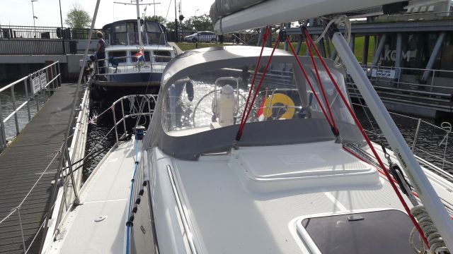 Um 9 Uhr lege ich in Stavoren ab. Vom Gemeindehafen ist es nur ein kurzes Stück auf die Einfädelspur für Sportboote zur Schleuse. Ob das Ansteigen des Puls vor der Schleuse irgendwann mal nachlässt ? Die Ampel zeigt Rot, so dass ich mehr oder weniger lässig meine Achterleine um die Klampe der Wartezone werfe. Leichter Schub voraus, so soll sich eigentlich der Bug wie von selbst an die Kaimauer schmiegen. Eigentlich ! Also doch das Bugstrahlruder zu Hilfe nehmen. Während ich noch so mit mir und dem Boot beschäftigt bin, nähert sich von hinten ein Motorboot und die Ampel springt um. Es kommt wie es kommen musste, die Achterleine bekomme ich nicht gelöst und ich stehe fast quer in der Fahrspur….Mist !