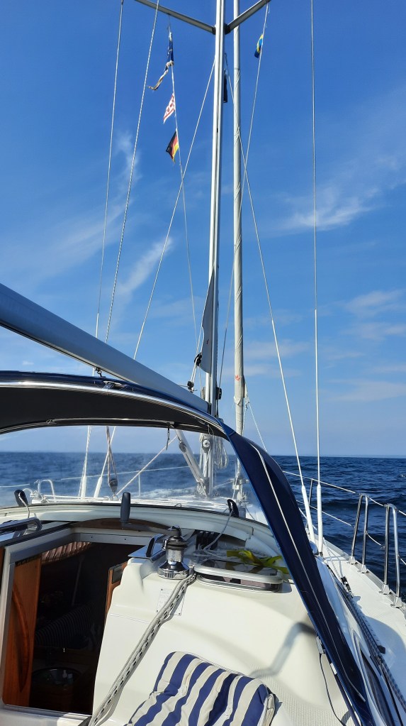 Windstärke 6 mit den angekündigten 7er Böen blieben für die nächsten Stunden bis zur Südspitze Falsters unsere Begleiter. Ab Höhe Fehmarnsund stieg auch die Wellenhöhe auf über 2 Meter mit der für die Ostsee üblichen kurzen Wellenlänge. Knapp gesagt: kurze und spitze Wellen, die einen permanent Fahrstuhl fahren ließen.