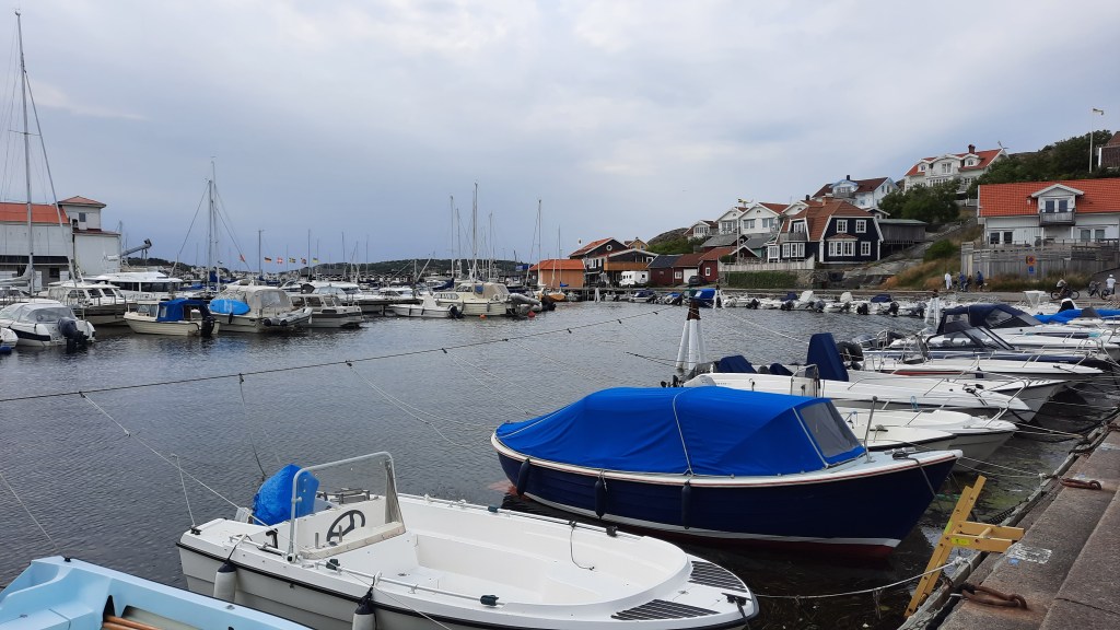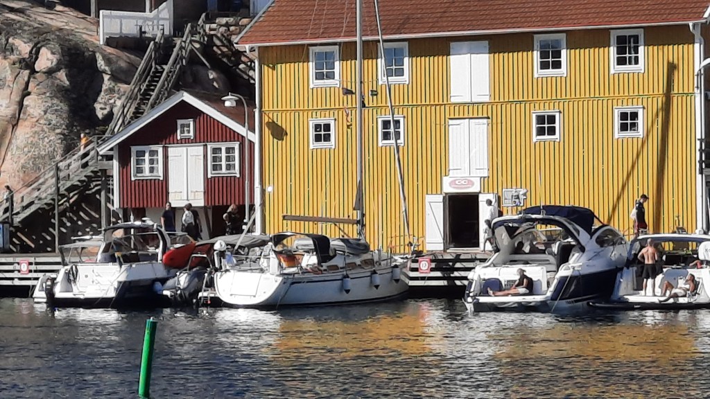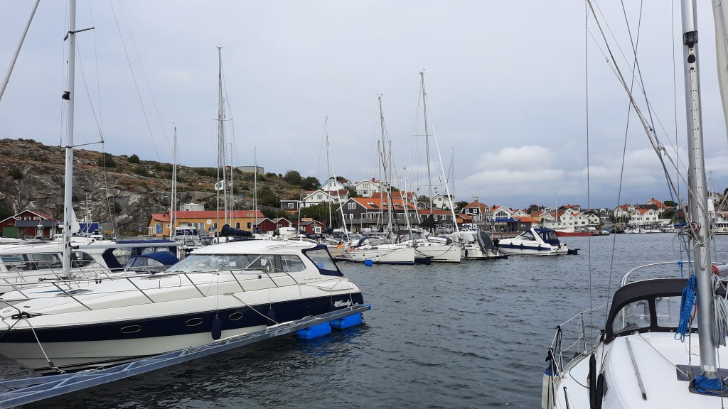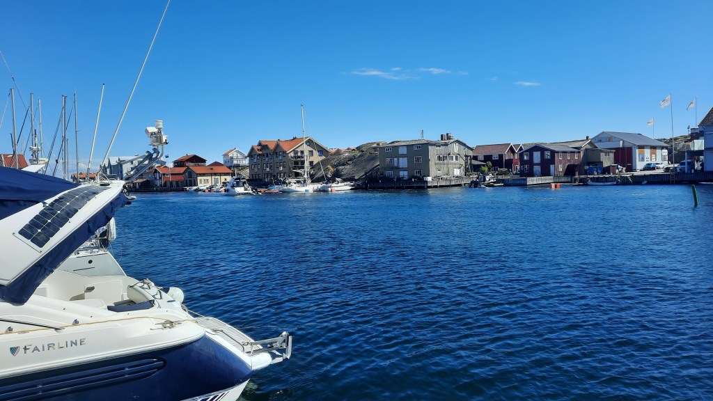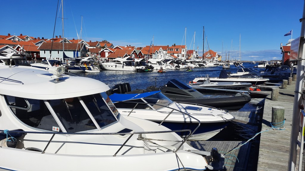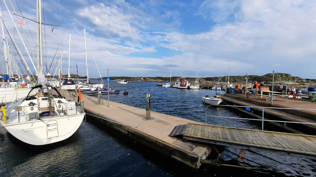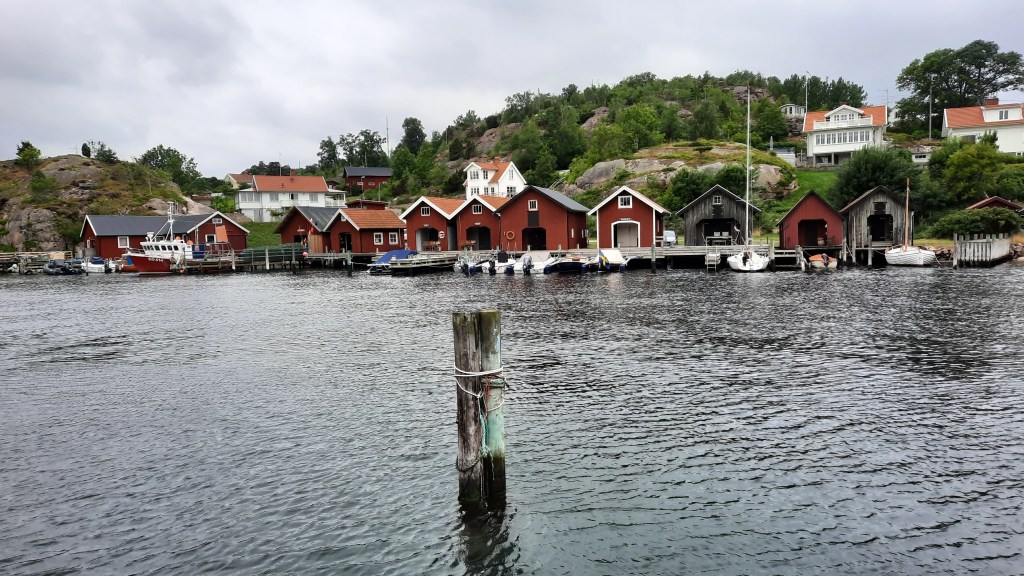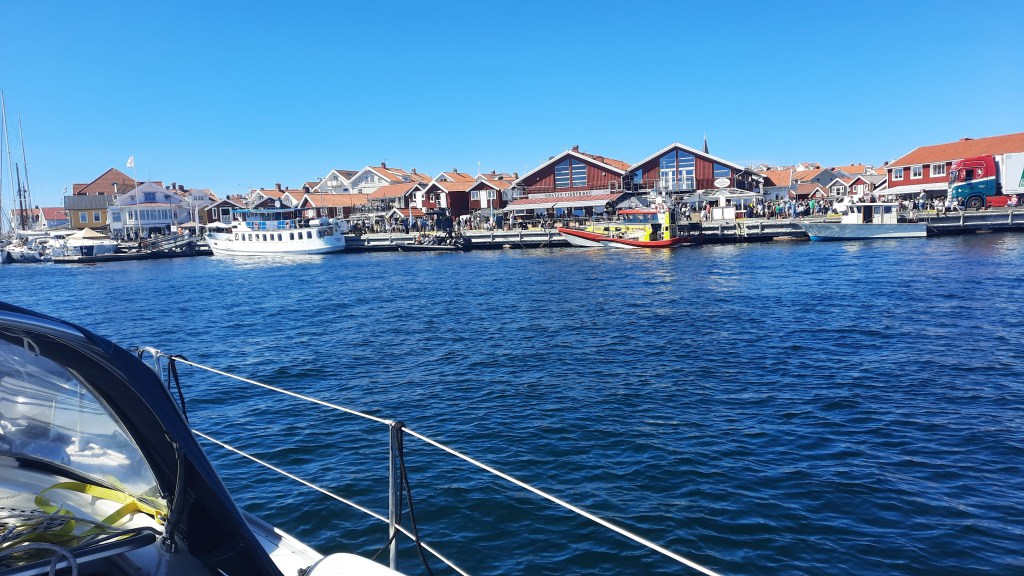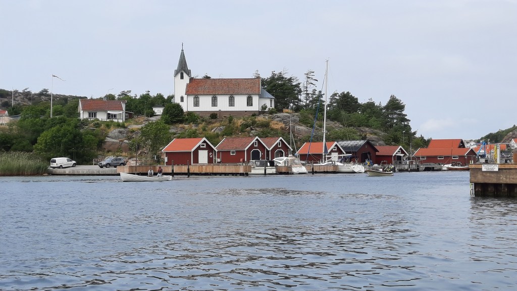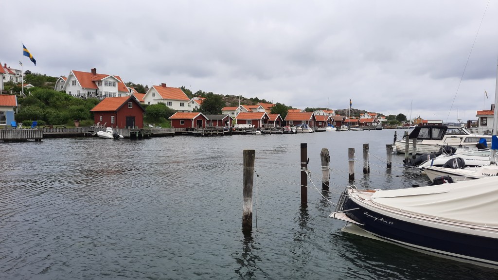Die Einfahrt in den Hamburgsund war wieder sehr schön. Beidseitig säumten viele rote Bootshäuser das Ufer. Kurz vor dem Hafen kreuzte die Seilfähre auf die Nachbarinsel Hamburgö unseren Weg. Bis sie das jeweils andere Ufer erreicht hatte, konnte niemand den Sund passieren.