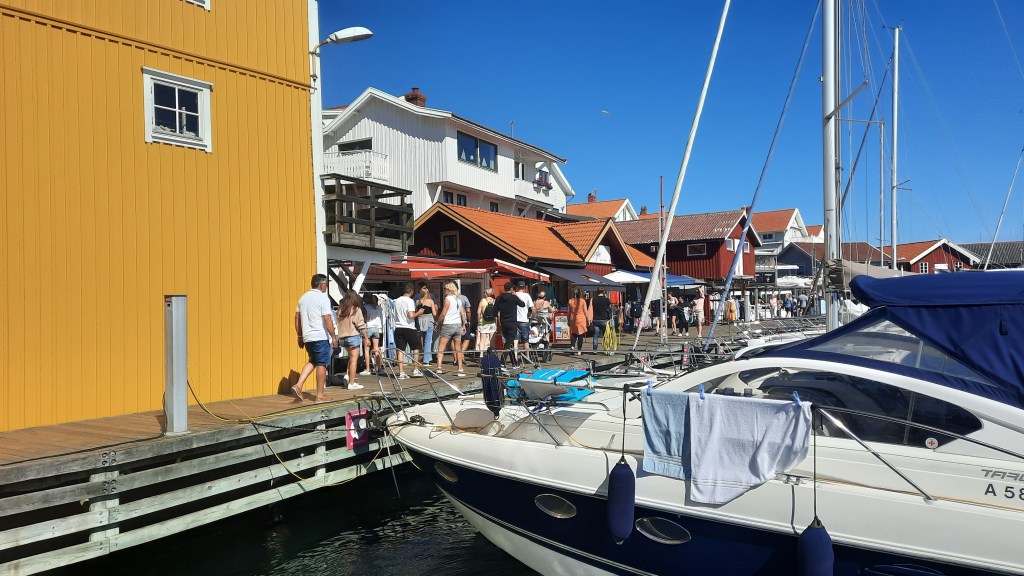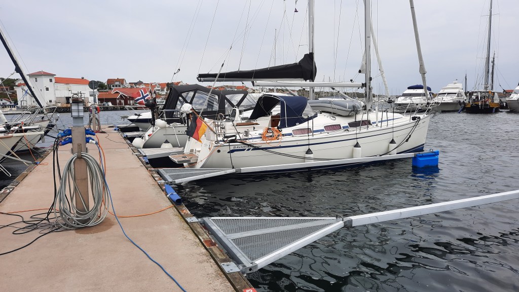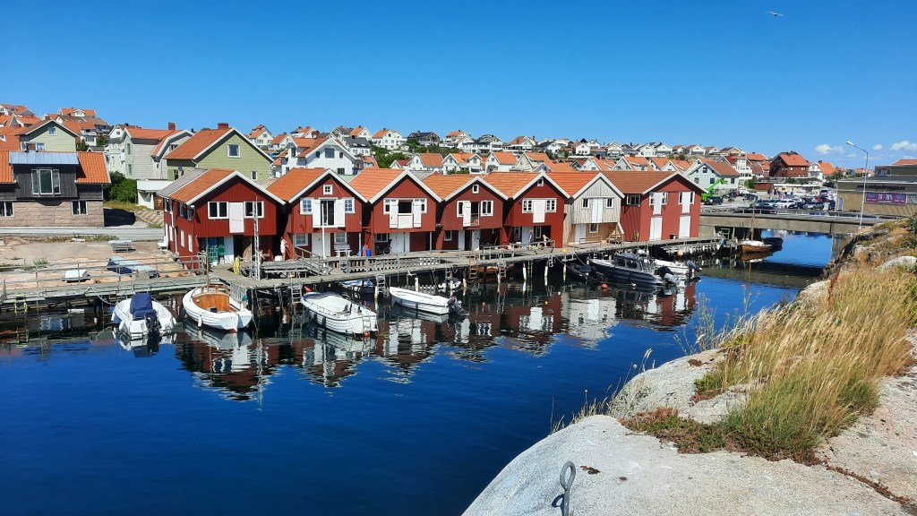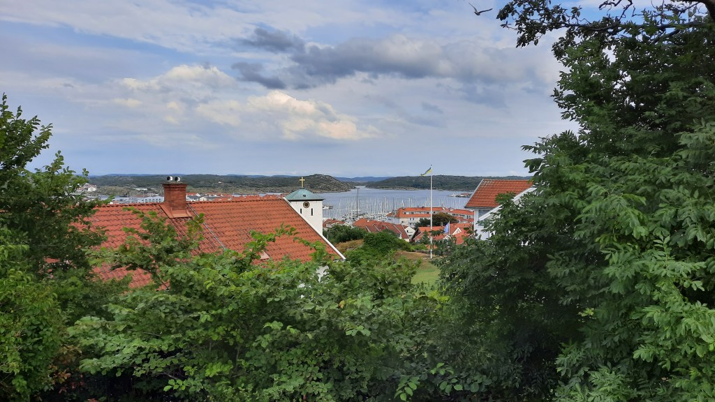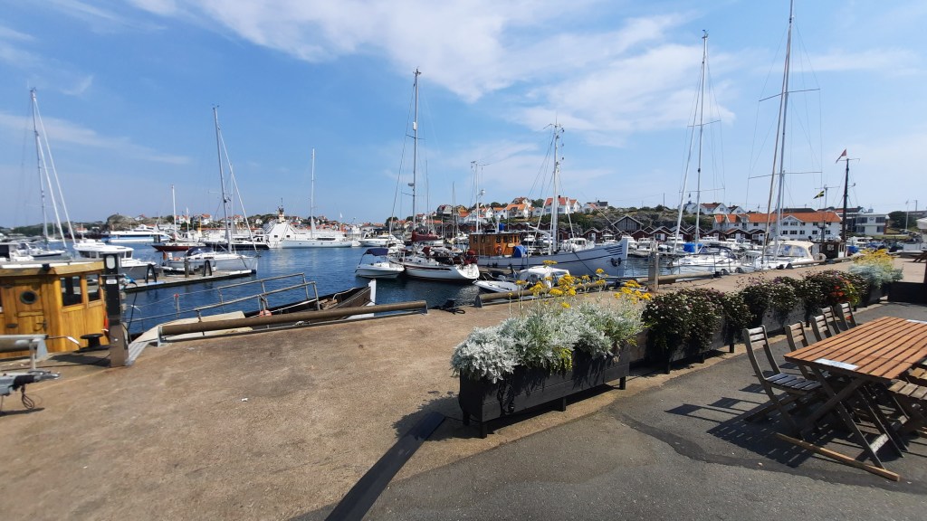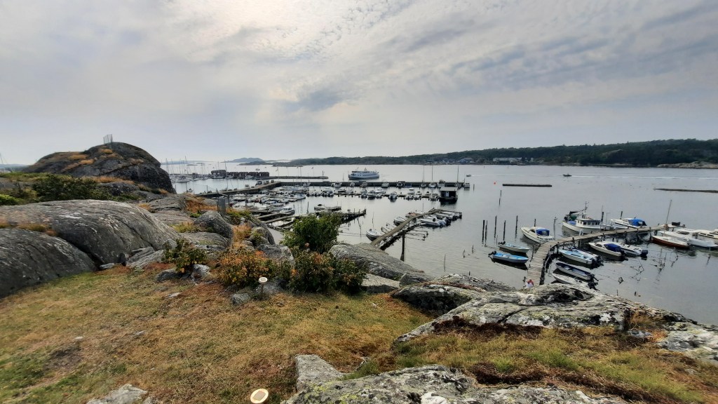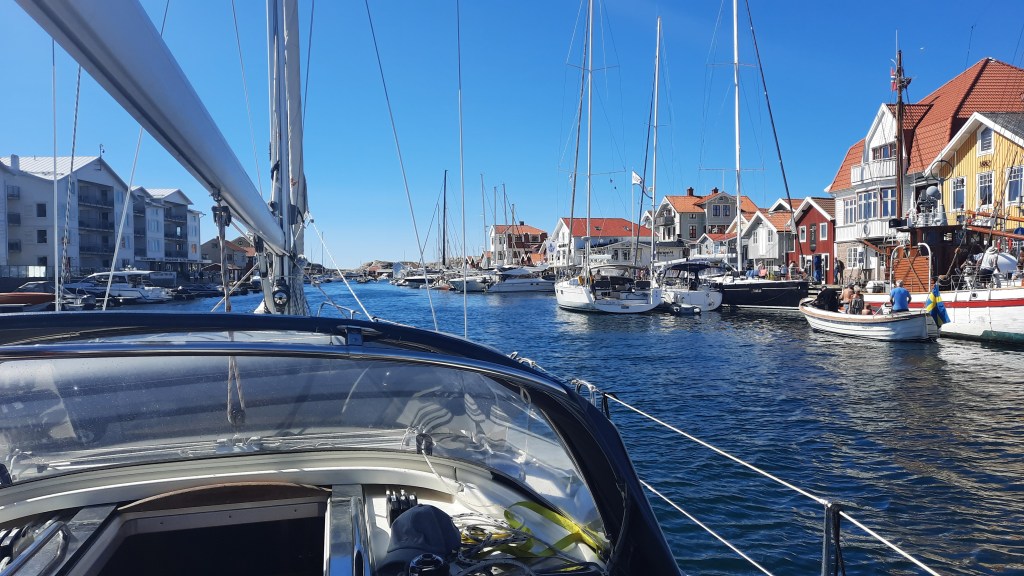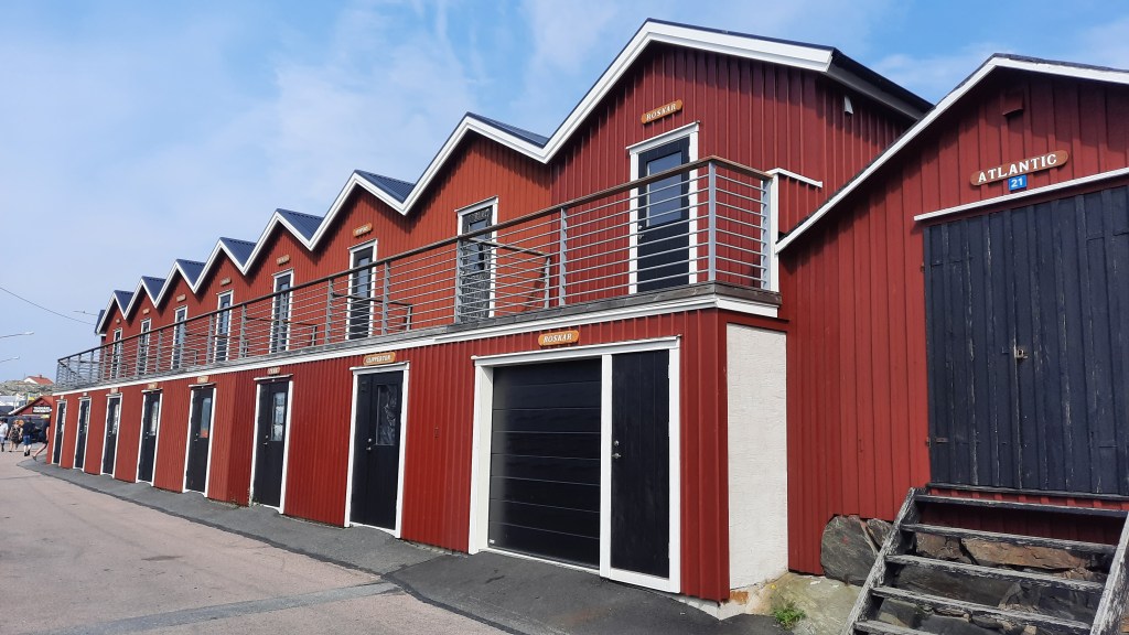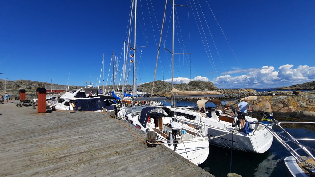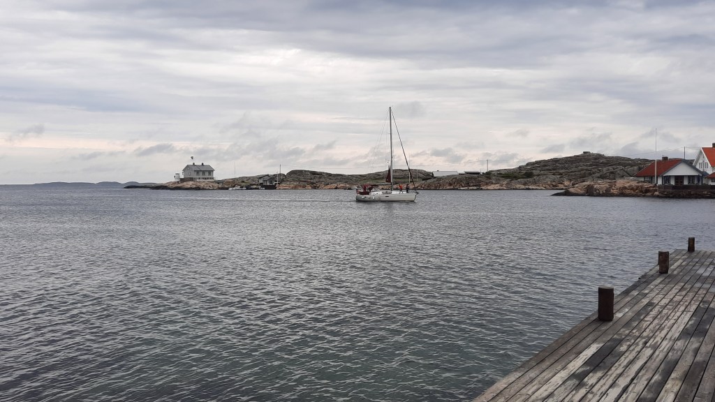 Die Einfahrt in den Hamburgsund war wieder sehr schön. Beidseitig säumten viele rote Bootshäuser das Ufer. Kurz vor dem Hafen kreuzte die Seilfähre auf die Nachbarinsel Hamburgö unseren Weg. Bis sie das jeweils andere Ufer erreicht hatte, konnte niemand den Sund passieren.