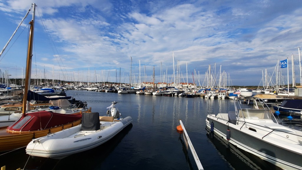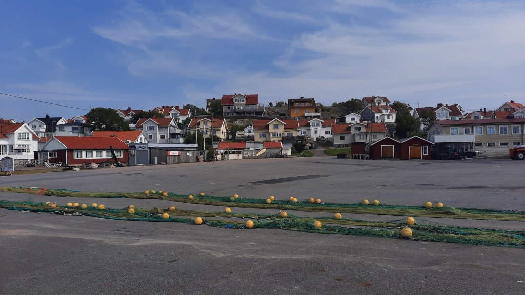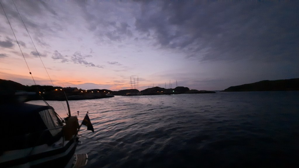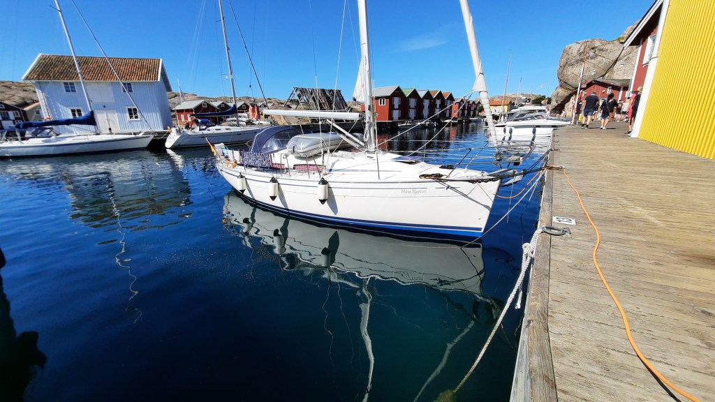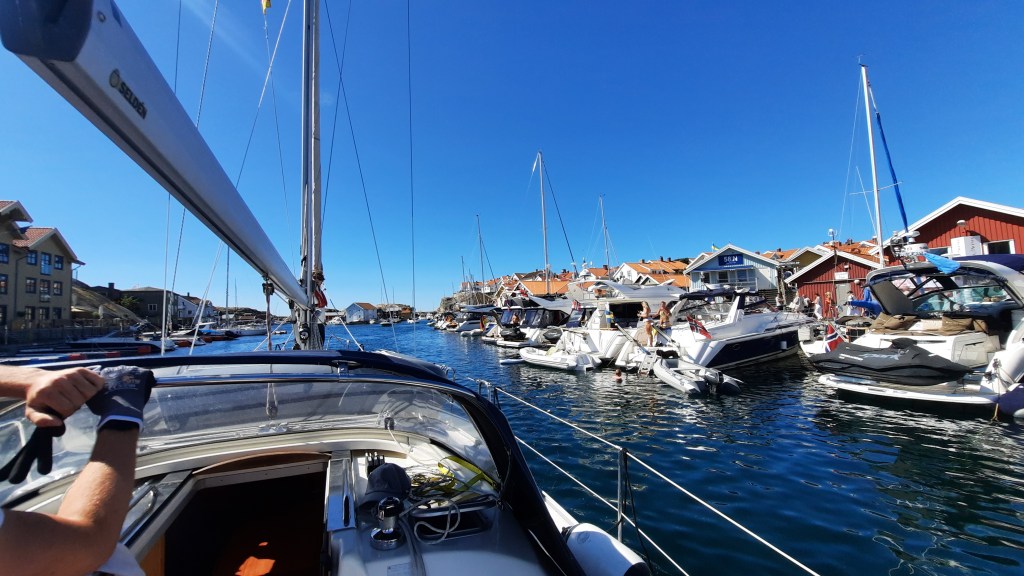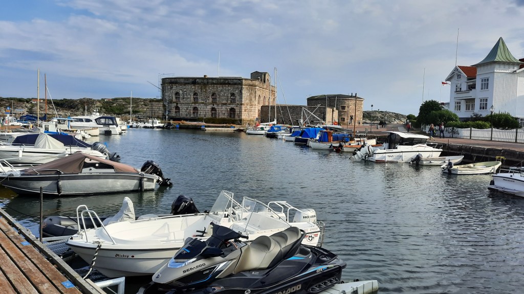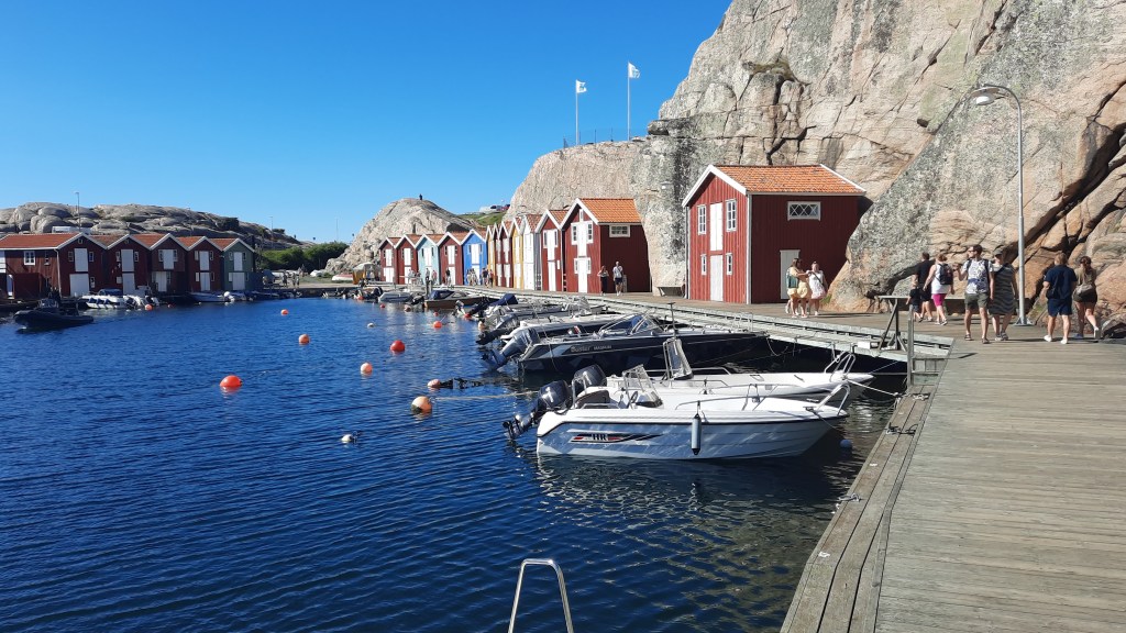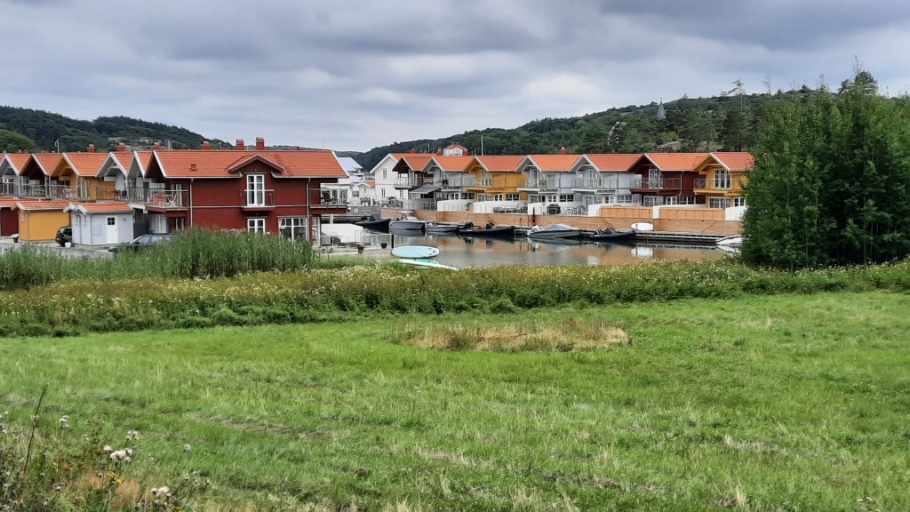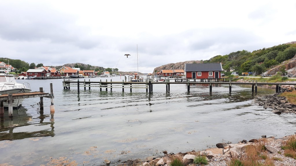 Die Einfahrt in den Hamburgsund war wieder sehr schön. Beidseitig säumten viele rote Bootshäuser das Ufer. Kurz vor dem Hafen kreuzte die Seilfähre auf die Nachbarinsel Hamburgö unseren Weg. Bis sie das jeweils andere Ufer erreicht hatte, konnte niemand den Sund passieren.