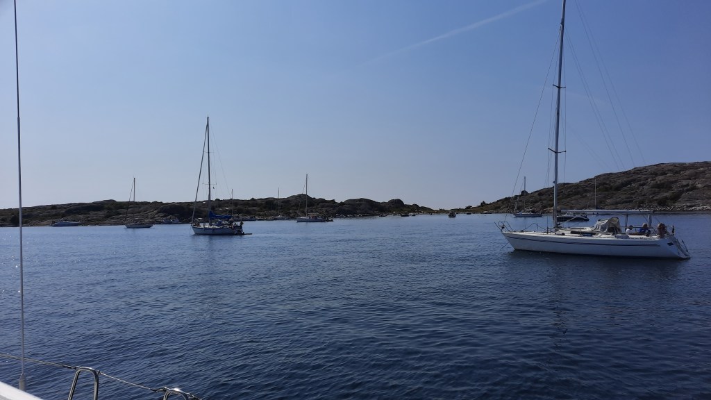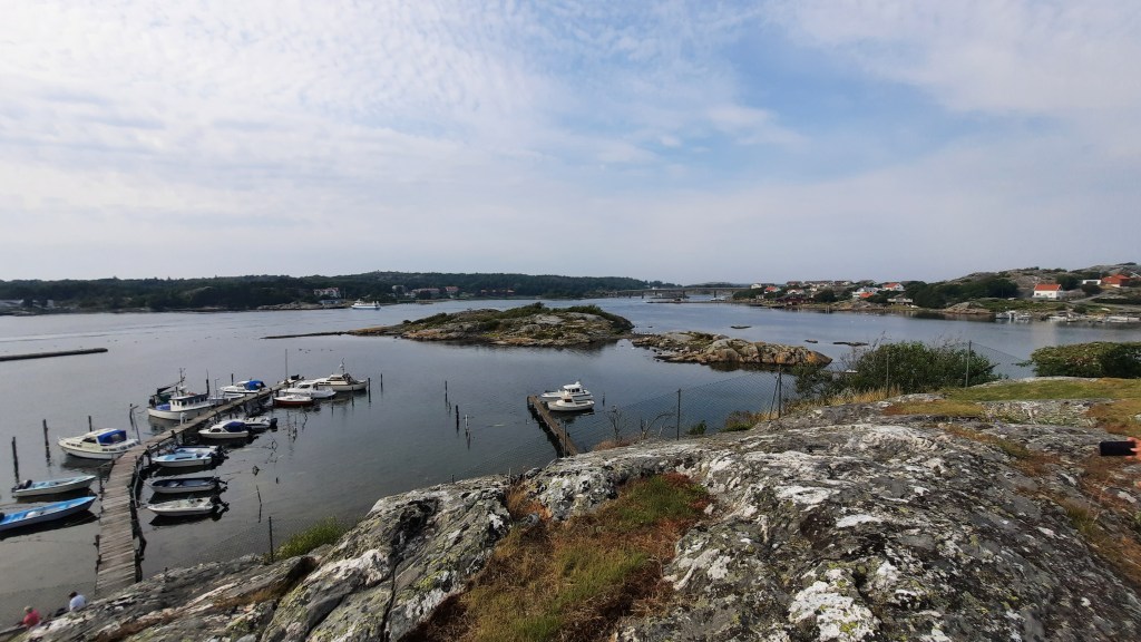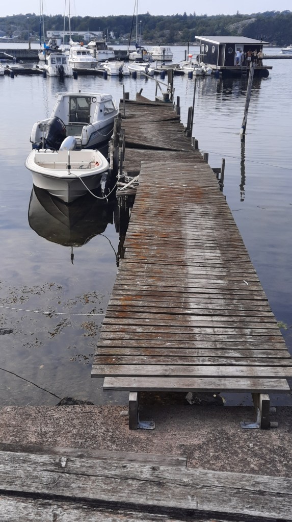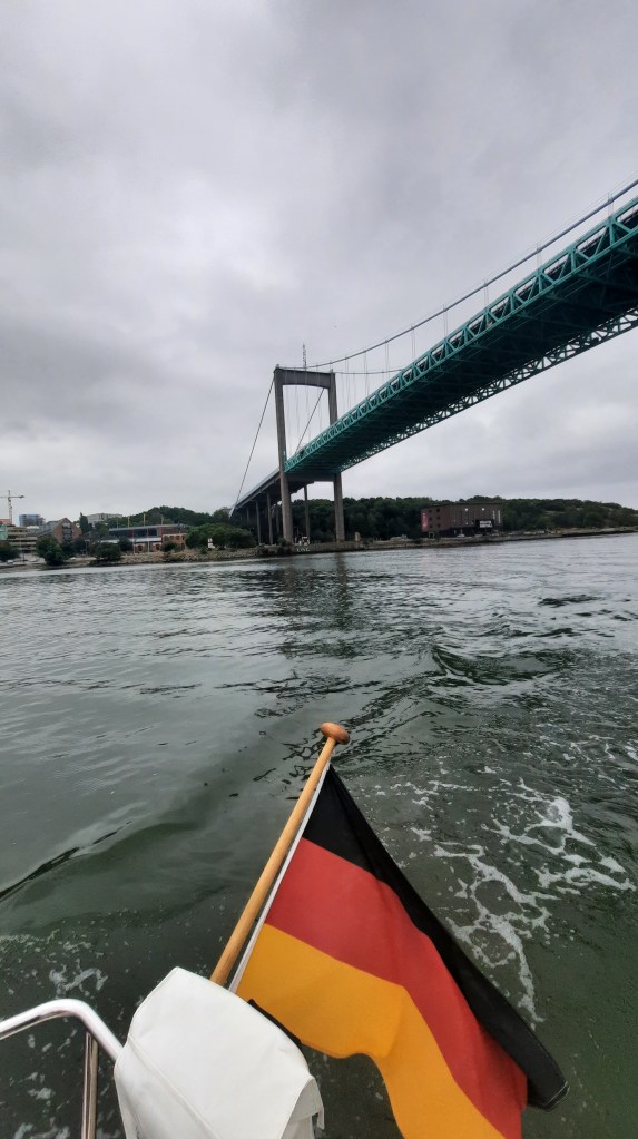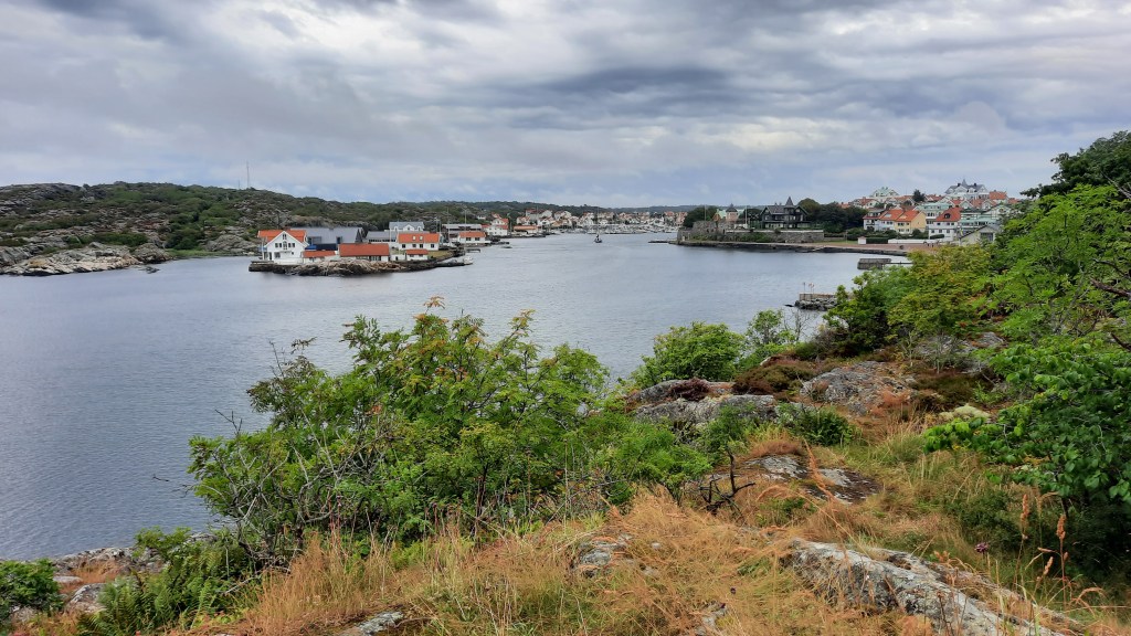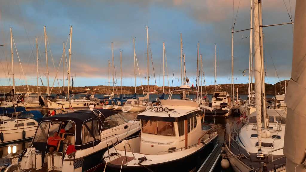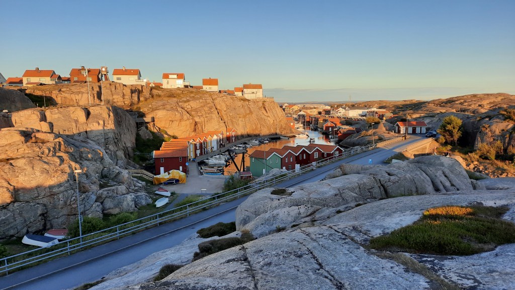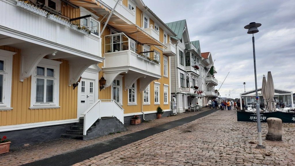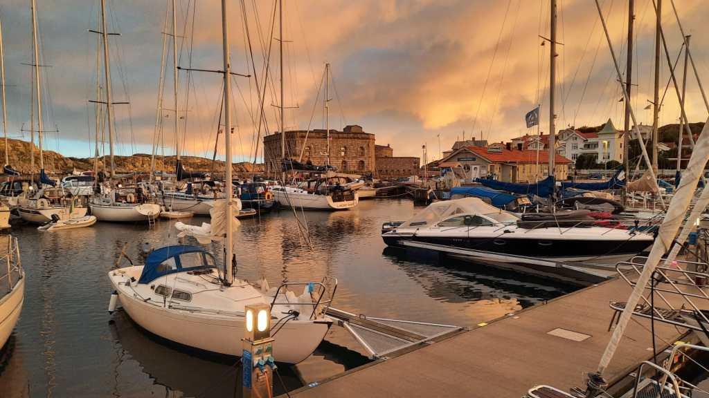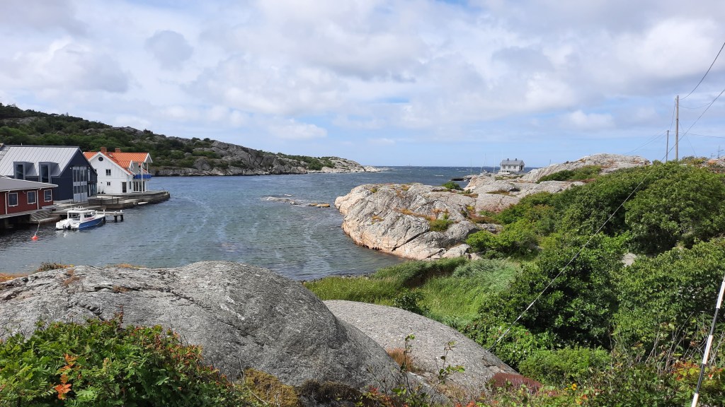 Die Einfahrt in den Hamburgsund war wieder sehr schön. Beidseitig säumten viele rote Bootshäuser das Ufer. Kurz vor dem Hafen kreuzte die Seilfähre auf die Nachbarinsel Hamburgö unseren Weg. Bis sie das jeweils andere Ufer erreicht hatte, konnte niemand den Sund passieren.