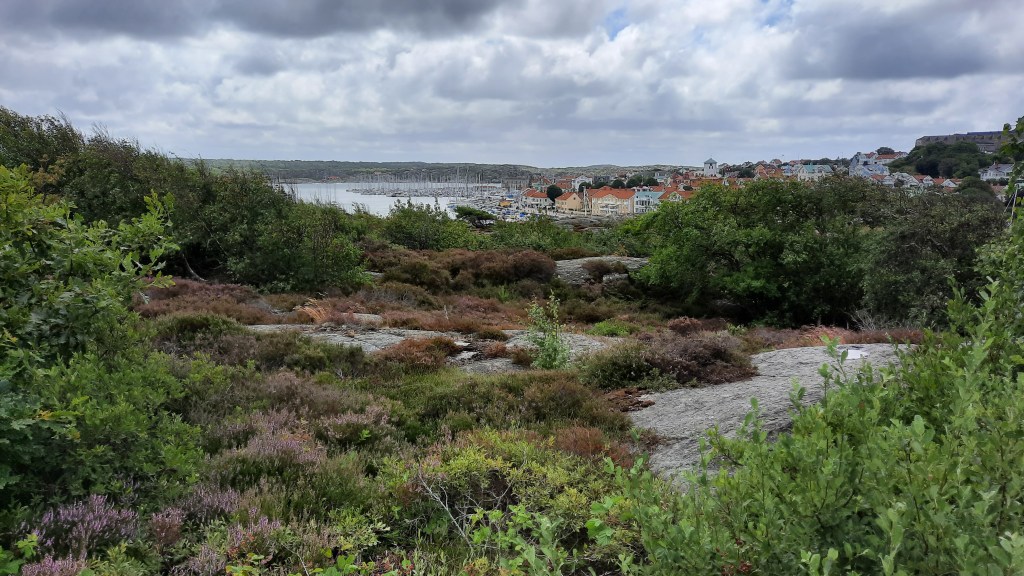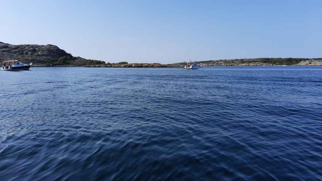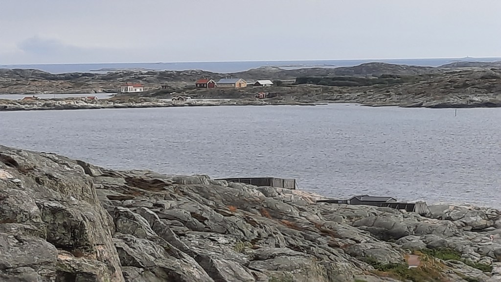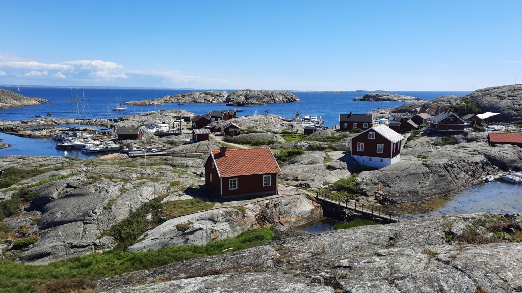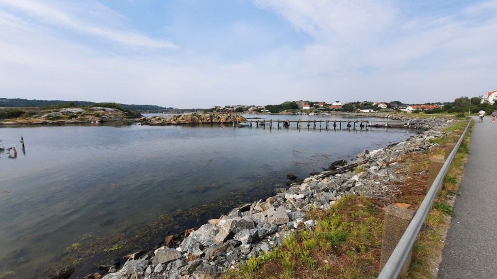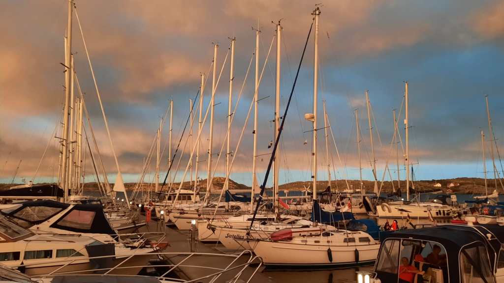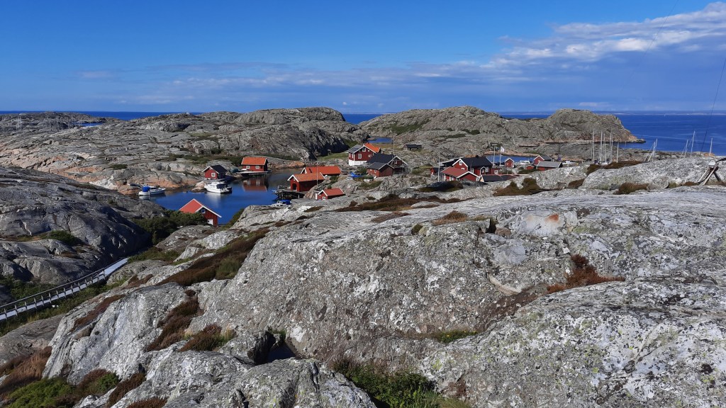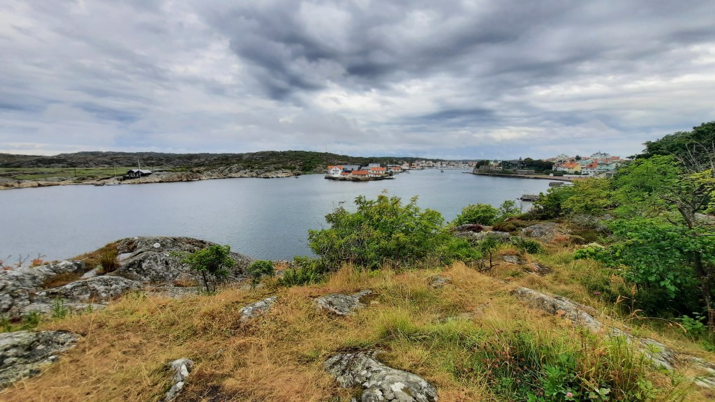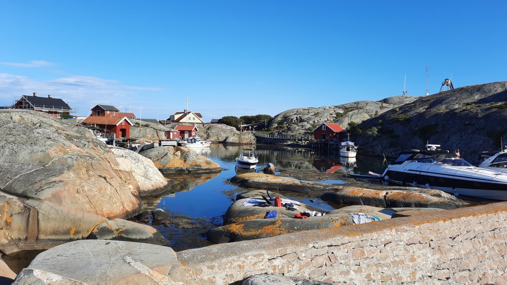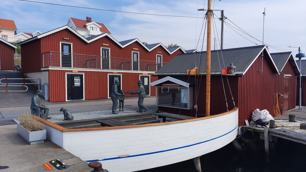 Die Einfahrt in den Hamburgsund war wieder sehr schön. Beidseitig säumten viele rote Bootshäuser das Ufer. Kurz vor dem Hafen kreuzte die Seilfähre auf die Nachbarinsel Hamburgö unseren Weg. Bis sie das jeweils andere Ufer erreicht hatte, konnte niemand den Sund passieren.