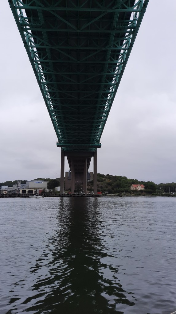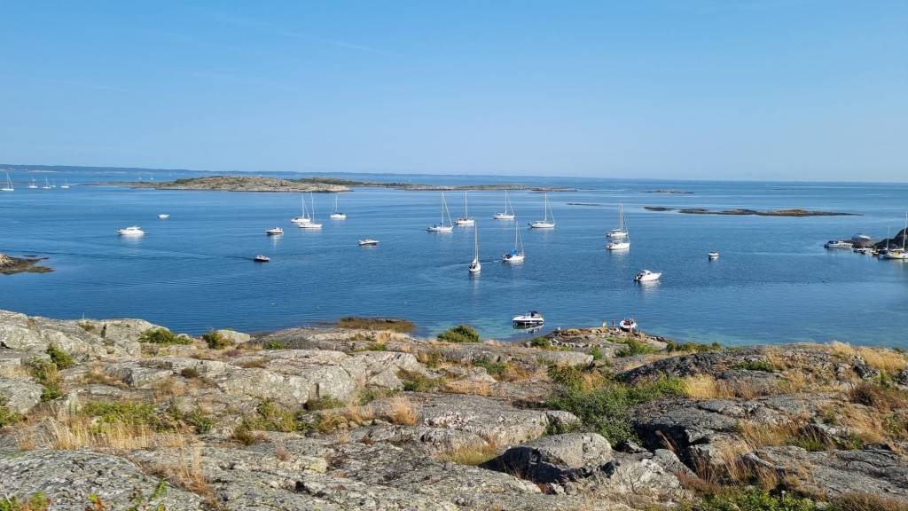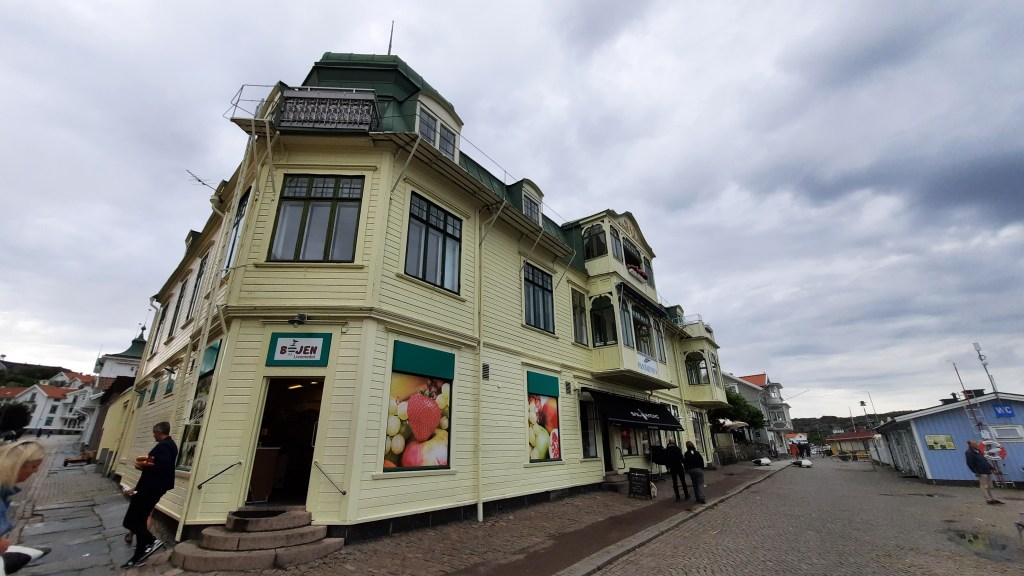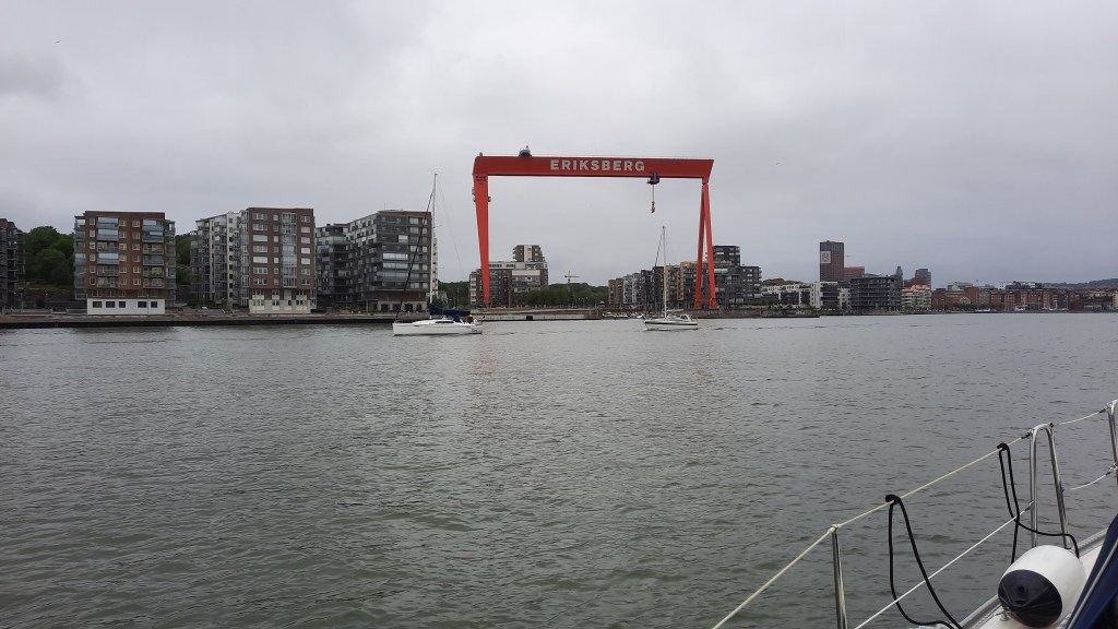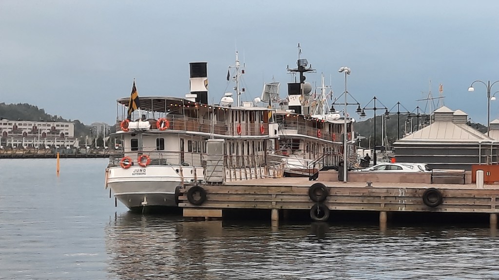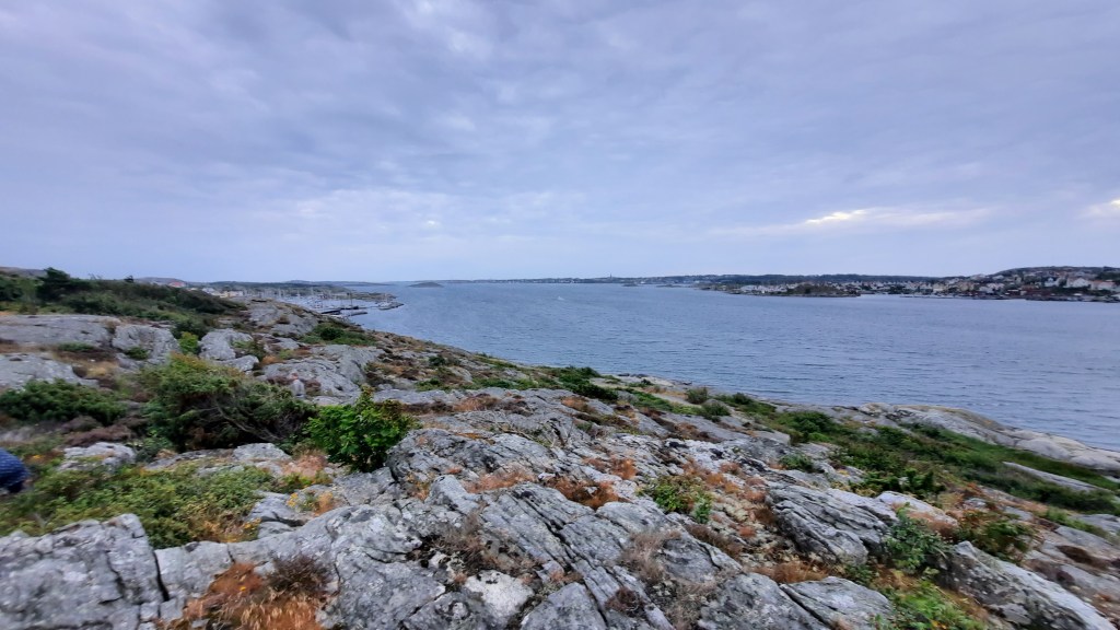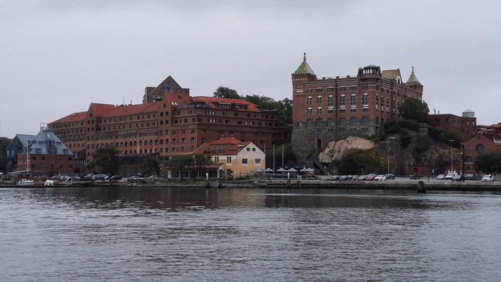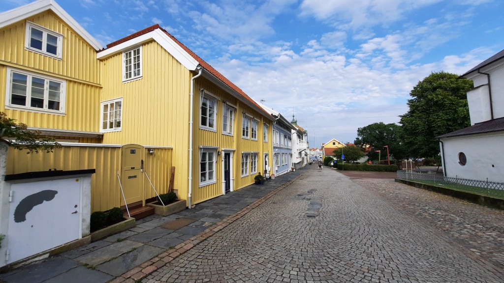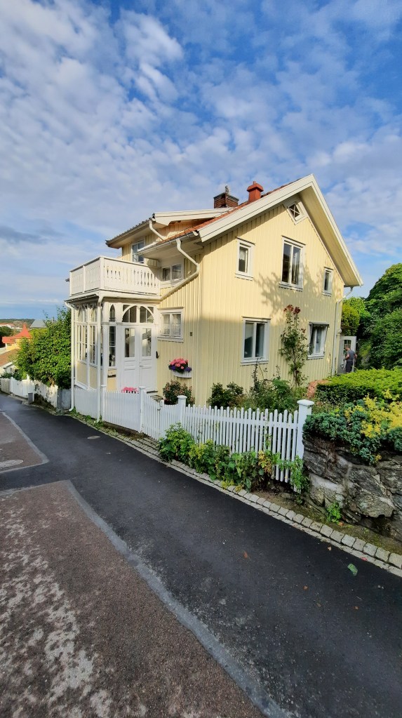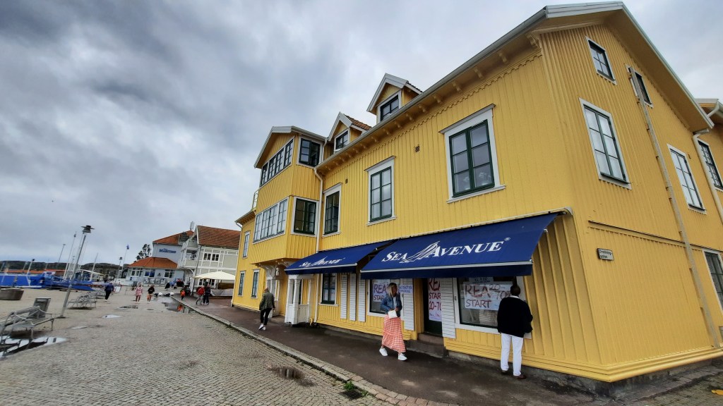 Die Einfahrt in den Hamburgsund war wieder sehr schön. Beidseitig säumten viele rote Bootshäuser das Ufer. Kurz vor dem Hafen kreuzte die Seilfähre auf die Nachbarinsel Hamburgö unseren Weg. Bis sie das jeweils andere Ufer erreicht hatte, konnte niemand den Sund passieren.