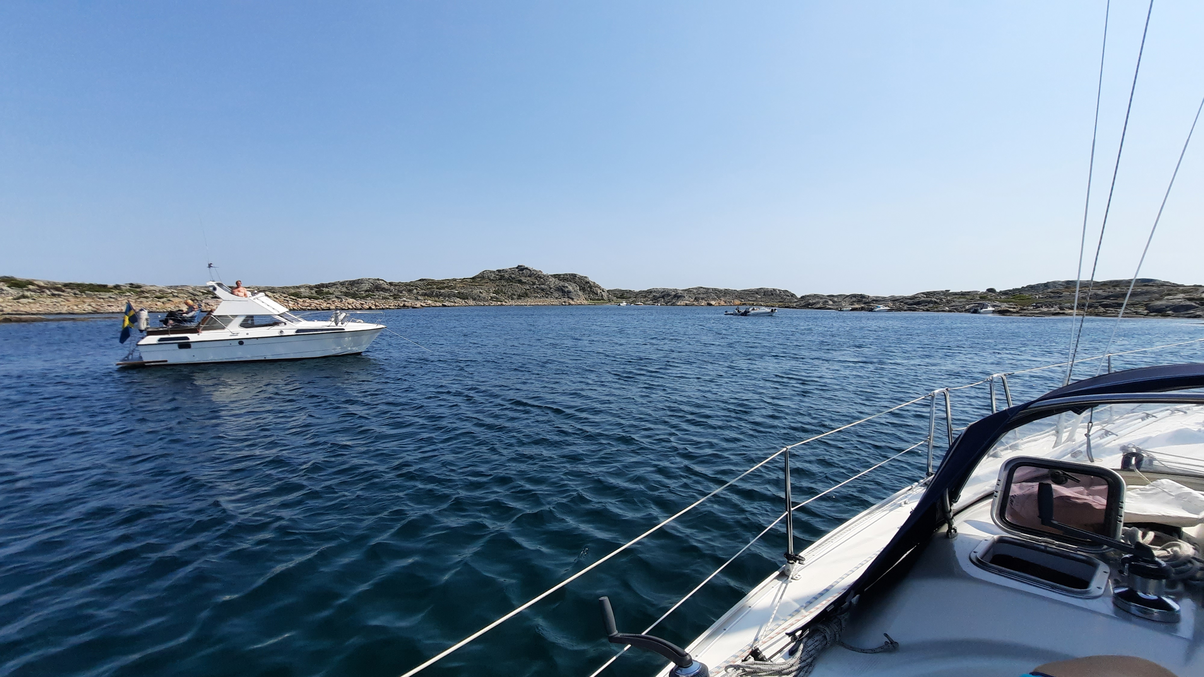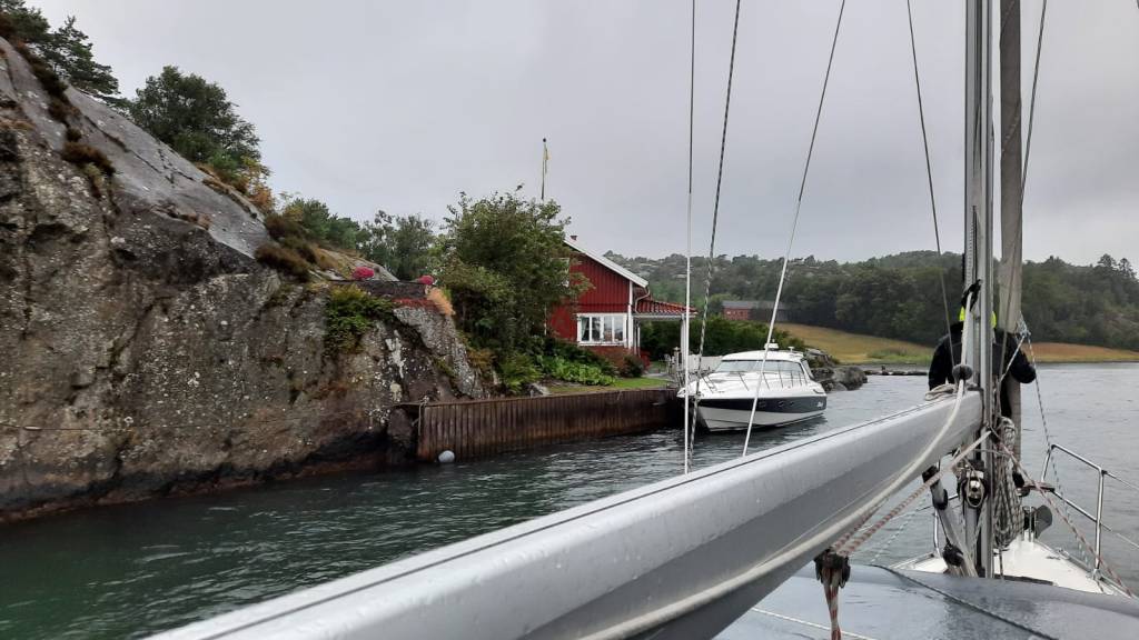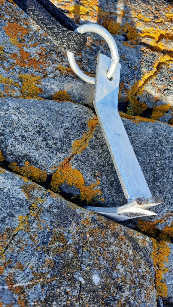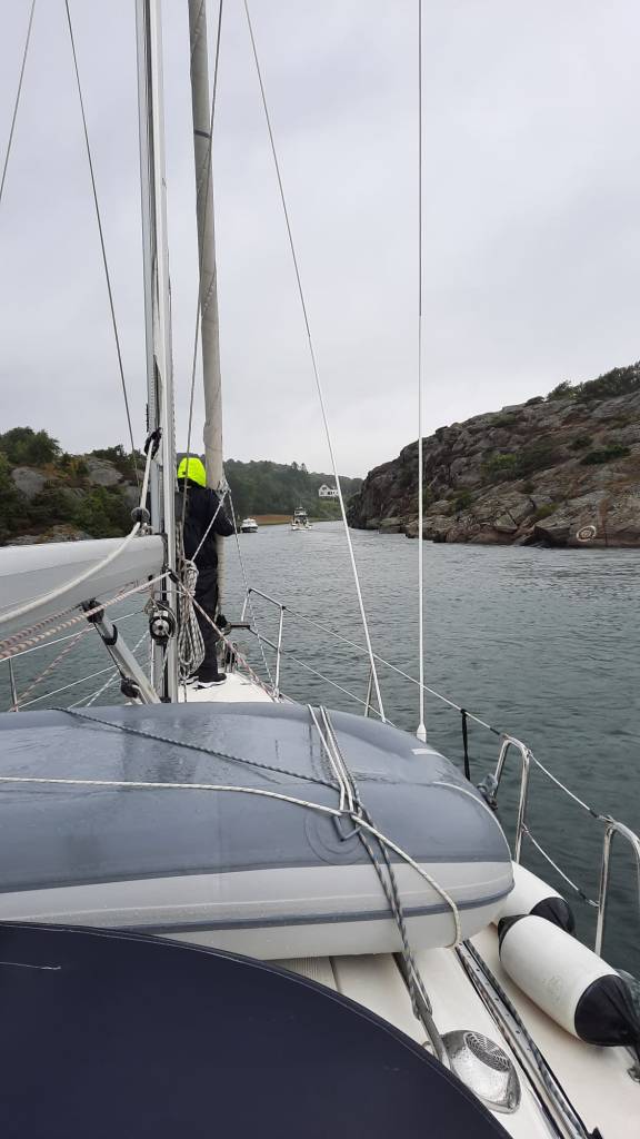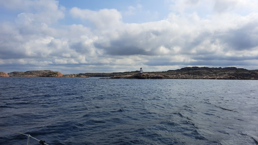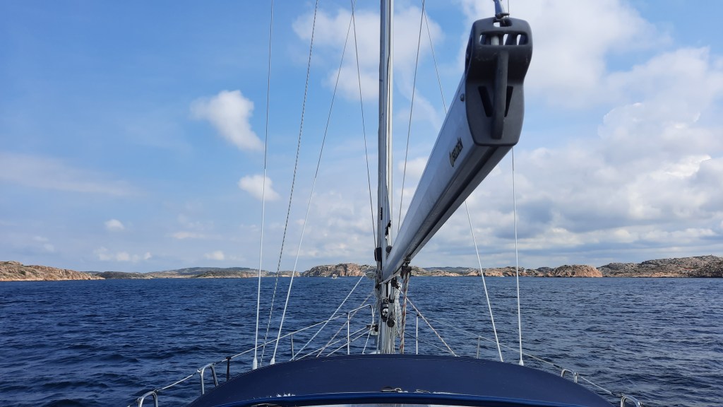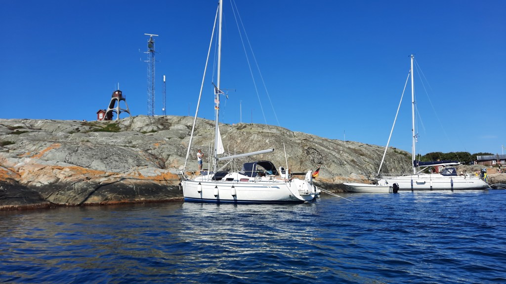 Am Morgen wartete dann die Herausforderung, dass die Vorleinen samt Schärennagel wieder einzusammeln und den Einsammler auch wieder an Bord zu bekommen. Das Boot war nach dem Lösen an Bug nicht mehr fixiert, sollte aber auch nicht gegen den Stein rammen und trotzdem einen möglichst geringen Abstand haben. Letztlich klappte alles besser als befürchtet und wir machten uns auf die etwa 11 Seemeilen kurze Strecke in Richtung Osten.