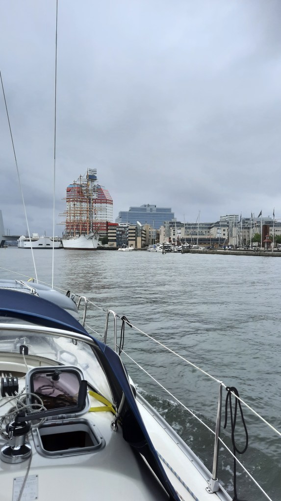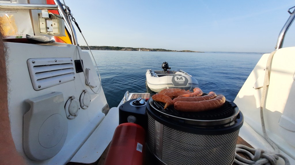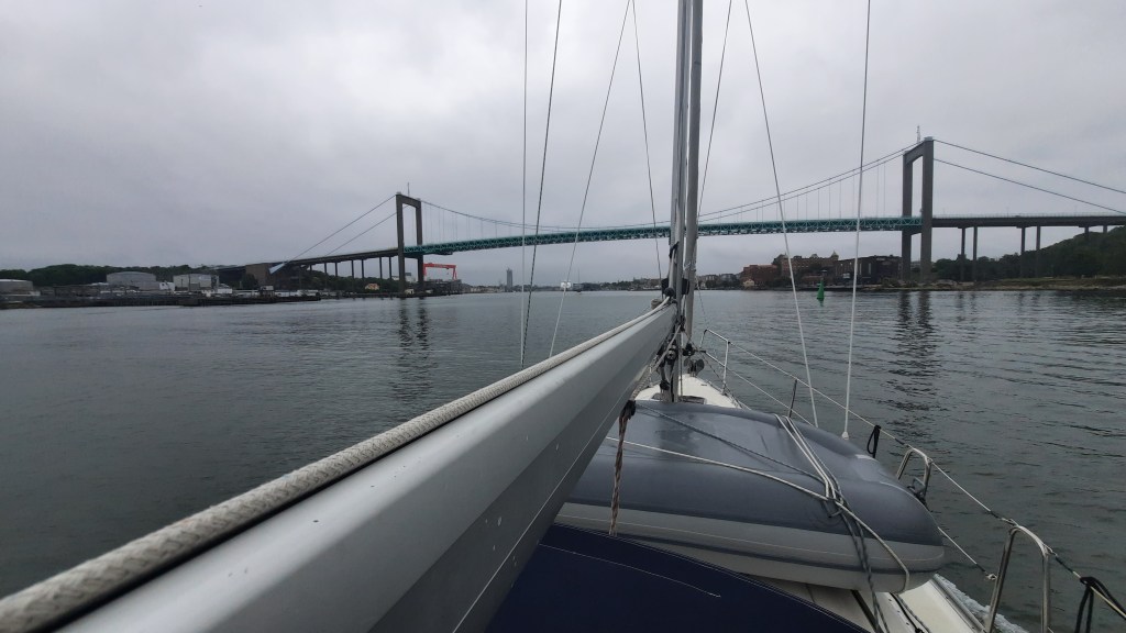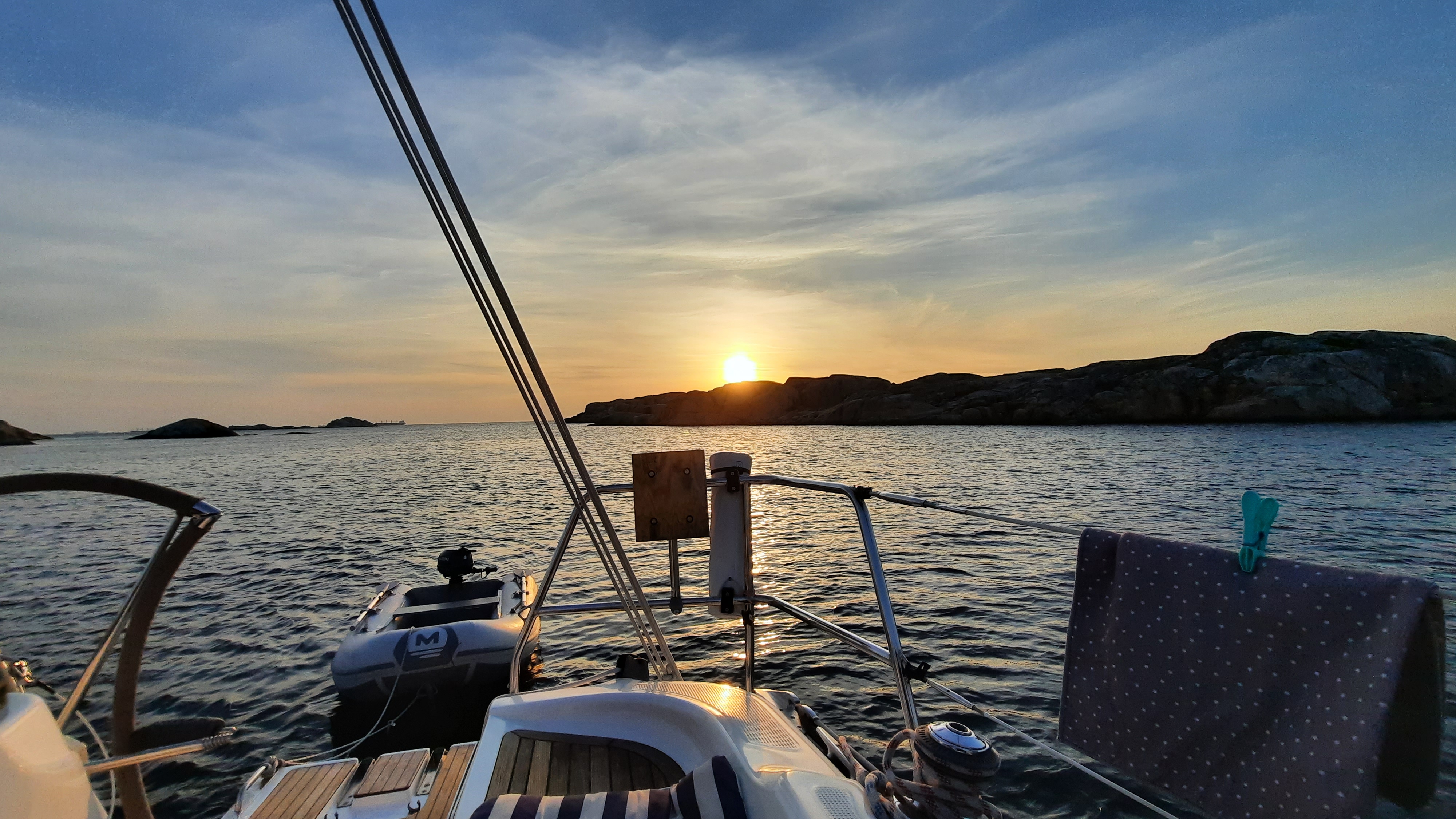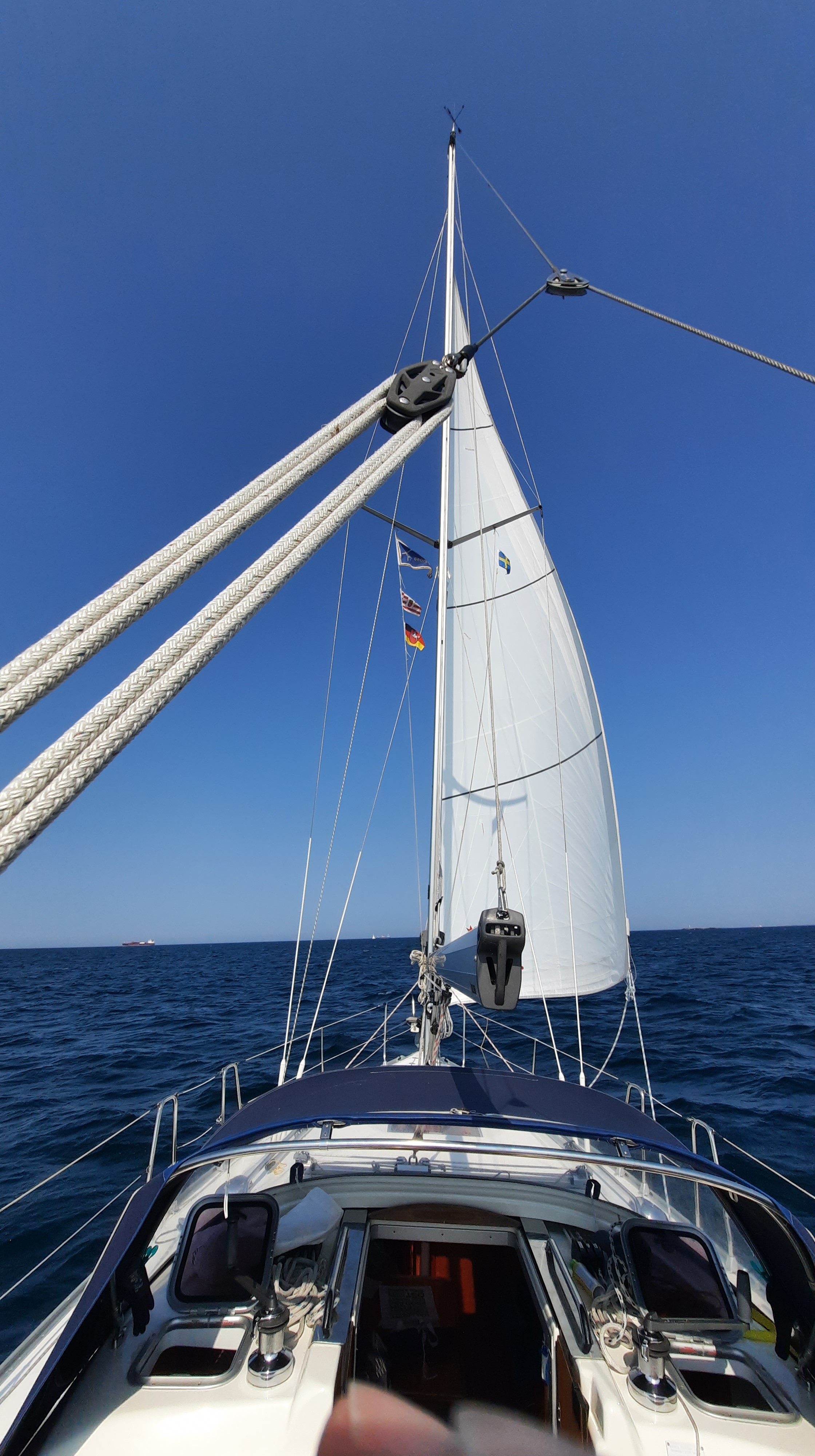 Am Morgen wartete dann die Herausforderung, dass die Vorleinen samt Schärennagel wieder einzusammeln und den Einsammler auch wieder an Bord zu bekommen. Das Boot war nach dem Lösen an Bug nicht mehr fixiert, sollte aber auch nicht gegen den Stein rammen und trotzdem einen möglichst geringen Abstand haben. Letztlich klappte alles besser als befürchtet und wir machten uns auf die etwa 11 Seemeilen kurze Strecke in Richtung Osten.