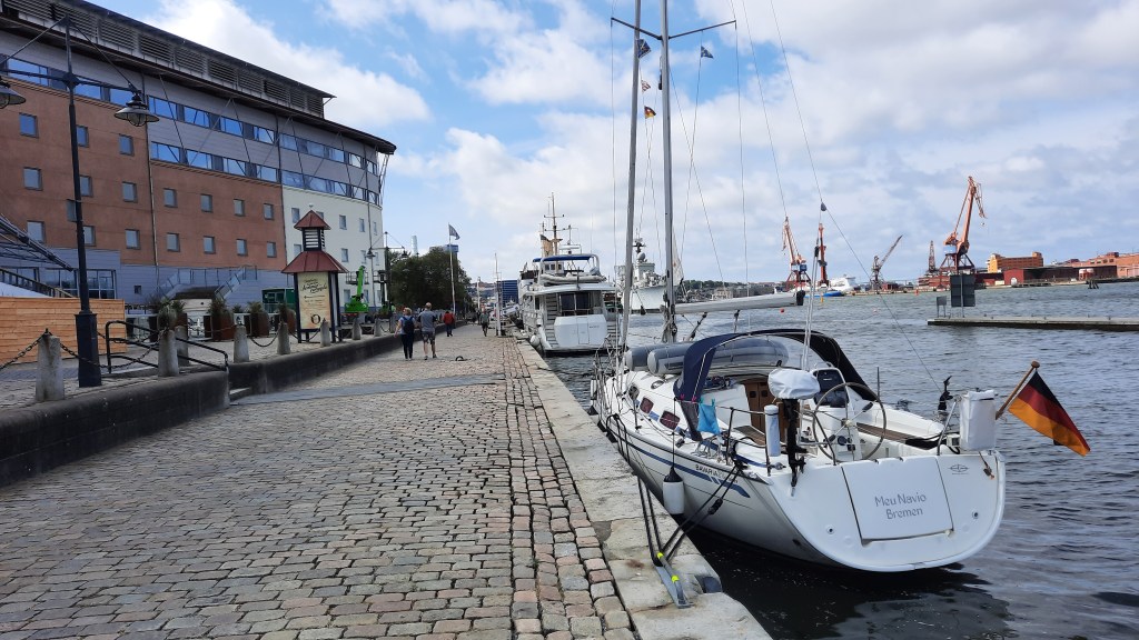 Die Nacht war wieder unruhig. Das lag nicht nur an dem Nachbarboot, dessen Besatzung sich bis zum frühen Morgen laut unterhaltend mit diversen Bieren beschäftigte, sondern vielmehr an der Welle, die immer wieder seitlich auf unser Boot traf. Durch die Befestigung an Bug und Heck schaukelt wir mehr oder weniger ruckartig seitlich wie in einer Hängematte.